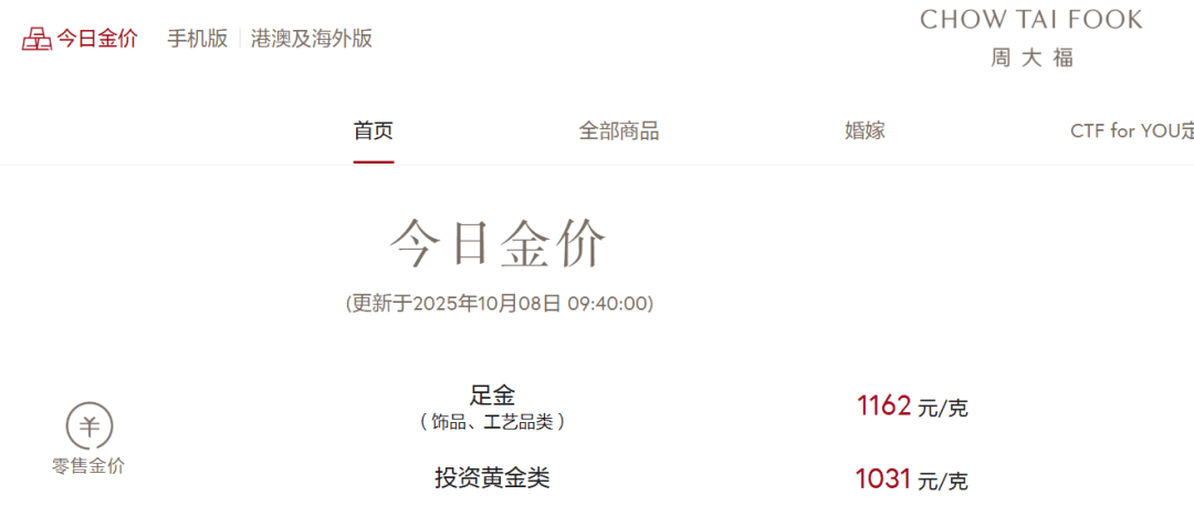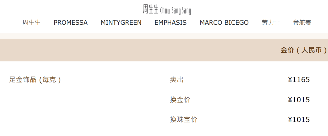随着国际金价近日大涨,国内黄金饰品价格也水涨船高。截至发稿,周生生足金饰品价格涨至1165元/克,周大福足金饰品价格为1162元/克。