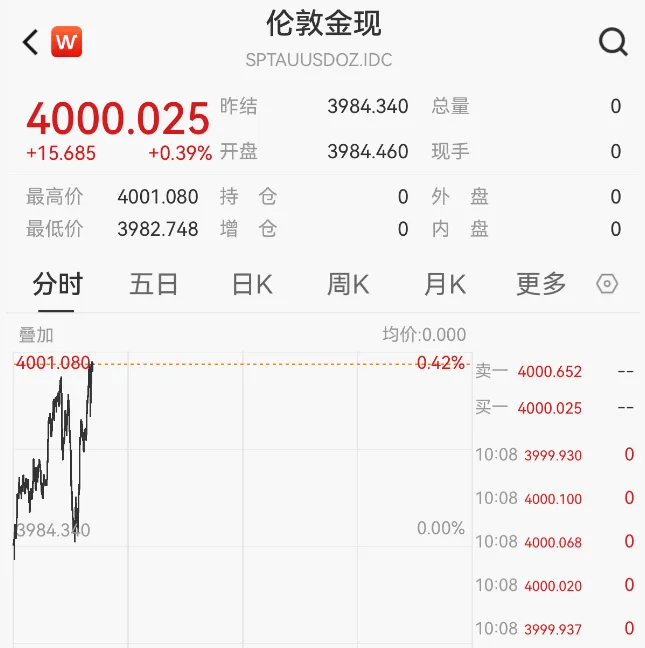 见证历史:黄金首次突破4000... 王爷说财经讯:就在今天(10 月 8 日)上午,现货黄金一举冲破 4000 美元 / 盎司大关,最高...