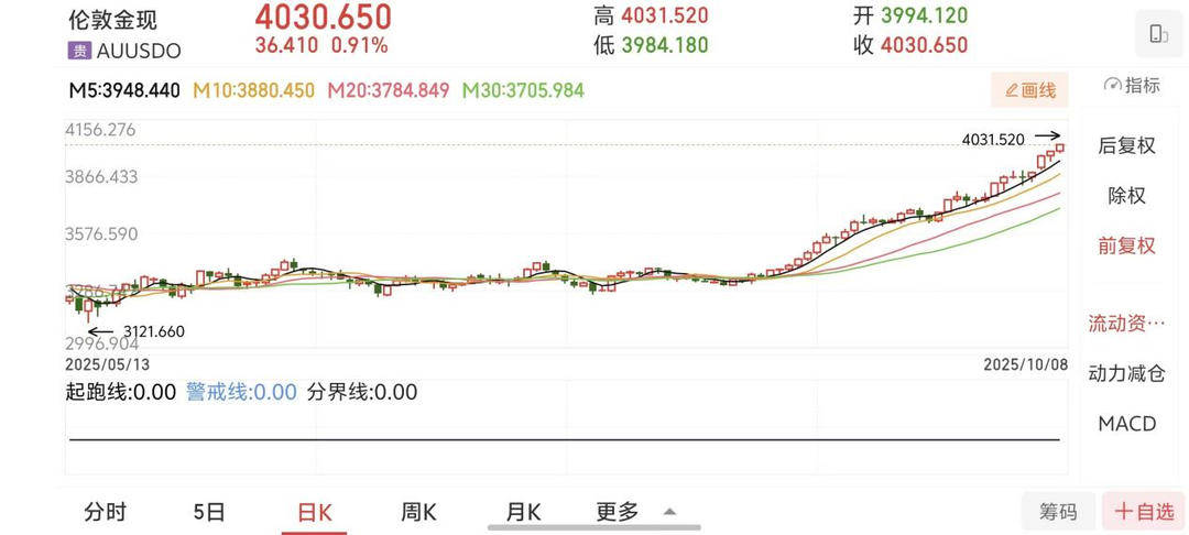 10月8日,现货黄金突破每盎司4000美元大关,续创新高,现货黄金一度高达4031.52美元,年内黄金涨幅高达53.57%;现货白银每盎司48.84美元,创2011年5月份以来新高,距历史高位即2011年4月的49.77美元/盎司仅一步之遥。