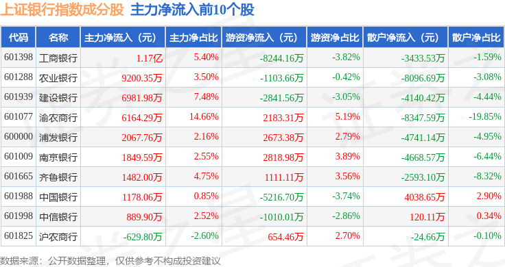 资金流向方面,上证银行(000134)指数成份股当日主力资金净流出合计23.28亿元,游资资金净流入合计12.05亿元,散户资金净流入合计11.23亿元。成份股资金流向详情见下表:
