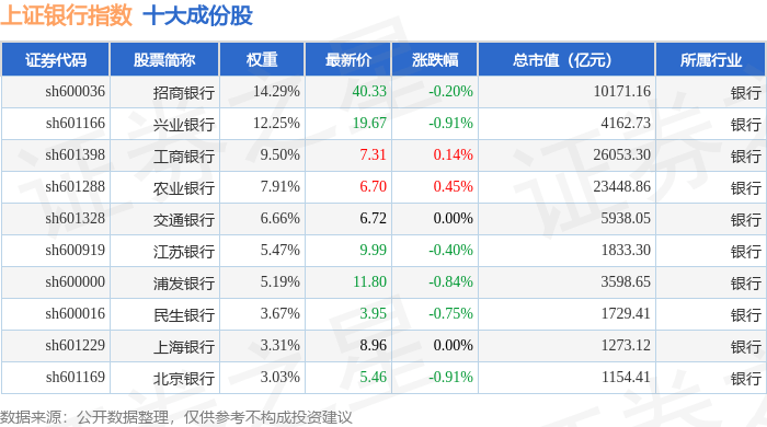 证券之星消息,10月9日,上证银行(000134)指数报收于982.62点,跌0.23%,成交299.99亿元,换手率0.32%。当日该指数成份股中,上涨的有9家,长沙银行以2.27%的涨幅领涨,下跌的有14家,渝农商行以2.12%的跌幅领跌。