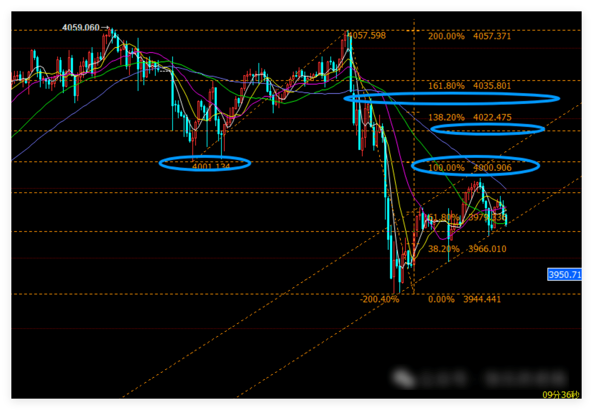 盘面上来看,4000美元大关,昨日白天反复支撑多头,美盘下破后快速跳水;且这里也是50%位置,那么这是今天第一个需要重点关注的区域。4000美元之下空头强势;如果意外突破4000美元,短期走强,行情将折腾,进一步关注0.618位置4015区域,然后是美盘二次下跌位置4030区域,继续防守看空头调整。