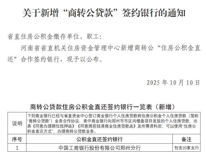 【大河财立方消息】10月10日,河南省省直机关住房资金管理中心发布通知,新增商转公“住房公积金直还”合作签约银行——工商银行郑州分行(包含20家支行)。