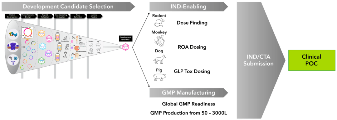 在此基础上,Kriya构建了覆盖从实验室到临床的完整体系,这一体系融合计算驱动的蛋白与载体设计、AAV血清型筛选、早期可制造性评估与动物模型验证,并与自有的大规模GMP产能打通,使候选产品能够快速进入临床开发并保持工艺一致性。借助这一闭环,Kriya不仅能高效孵化多条管线,还能在慢性病等大规模人群领域探索真正可持续的基因疗法。
