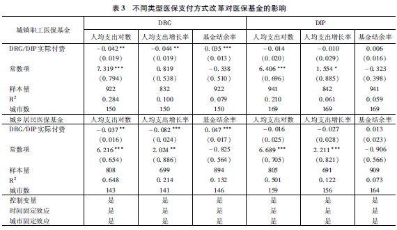 本节对DRG和DIP改革进行分组回归,分析二者改革效果的差异。表3展现了DRG和DIP改革对城镇职工和城乡居民医疗保险基金的影响。结果显示,DRG实际付费显著降低了两类医保基金人均支出、人均支出增长率,增加了基金结余率。而DIP实际付费对职工医疗保险和居民医疗保险基金的影响方向虽然符合预期,但效果均不显著。这表明DRG改革的控费效果优于DIP改革。