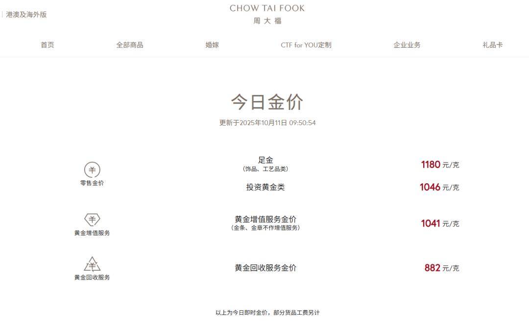 周大福、六福珠宝足金饰品为1180元/克,周生生足金饰品为1176元/克,均有明显上涨。