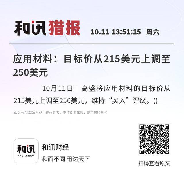 10月11日|高盛将应用材料的目标价从215美元上调至250美元,维持“买入”评级。