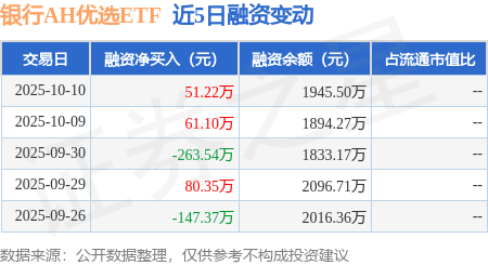 证券之星消息,10月10日,银行AH优选ETF(517900)融资买入162.11万元,融资偿还110.89万元,融资净买入51.22万元,融资余额1945.5万元。