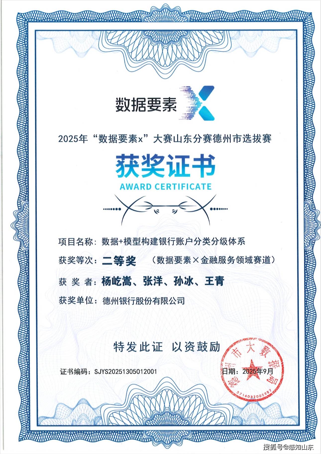 近日,2025年“数据要素X”大赛山东分赛决赛圆满落幕,德州银行“数据+模型构建银行账户分类分级系统”项目,从众多参赛单位中脱颖而出,荣获德州市选拔赛金融服务赛道二等奖,并代表德州市参加山东分赛决赛,荣获山东分赛决赛金融服务赛道优秀奖。