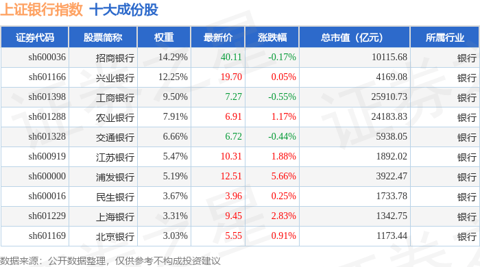 证券之星消息,10月13日,上证银行(000134)指数报收于995.31点,涨0.83%,成交392.73亿元,换手率0.41%。当日该指数成份股中,上涨的有18家,浦发银行以5.66%的涨幅领涨,下跌的有5家,邮储银行以0.88%的跌幅领跌。