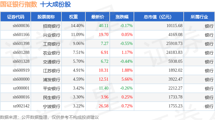 证券之星消息,10月13日,国证银行(399431)指数报收于7671.67点,涨0.79%,成交424.89亿元,换手率0.42%。当日该指数成份股中,上涨的有20家,浦发银行以5.66%的涨幅领涨,下跌的有7家,邮储银行以0.88%的跌幅领跌。