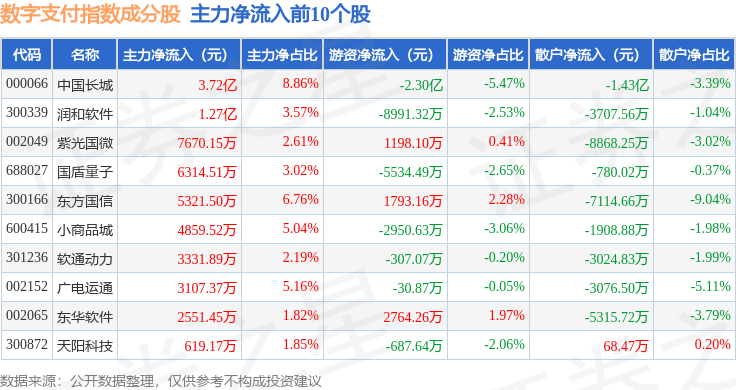 资金流向方面,数字支付(980113)指数成份股当日主力资金净流出合计5767.07万元,游资资金净流出合计3.65亿元,散户资金净流入合计4.23亿元。成份股资金流向详情见下表: