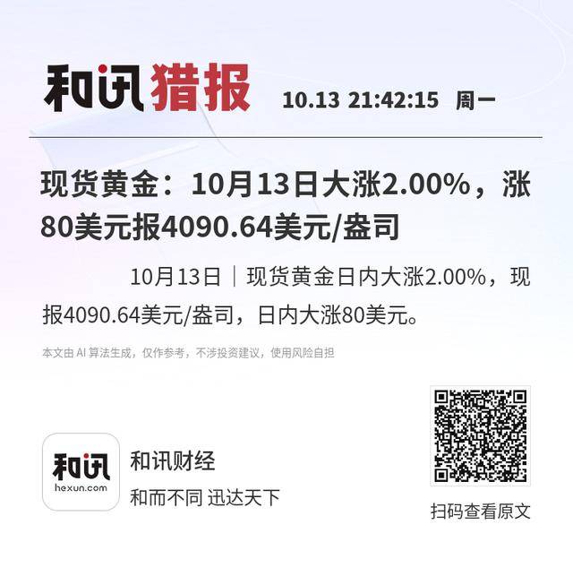 10月13日|现货黄金日内大涨2.00%,现报4090.64美元/盎司,日内大涨80美元。
