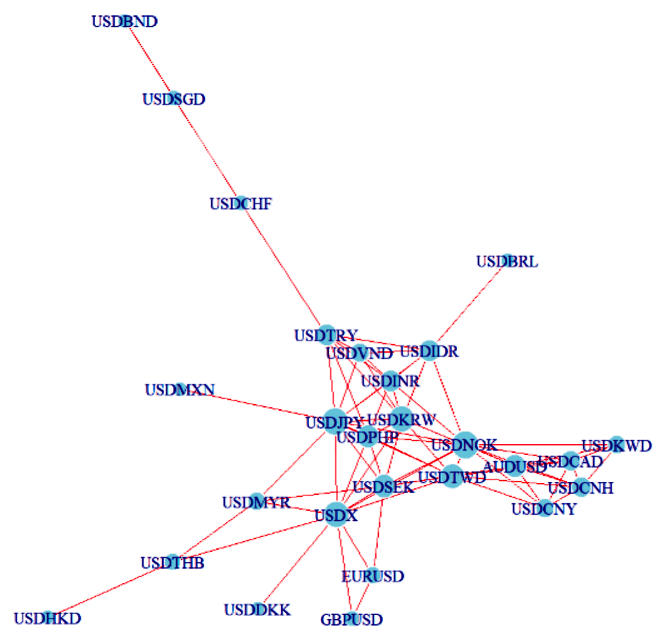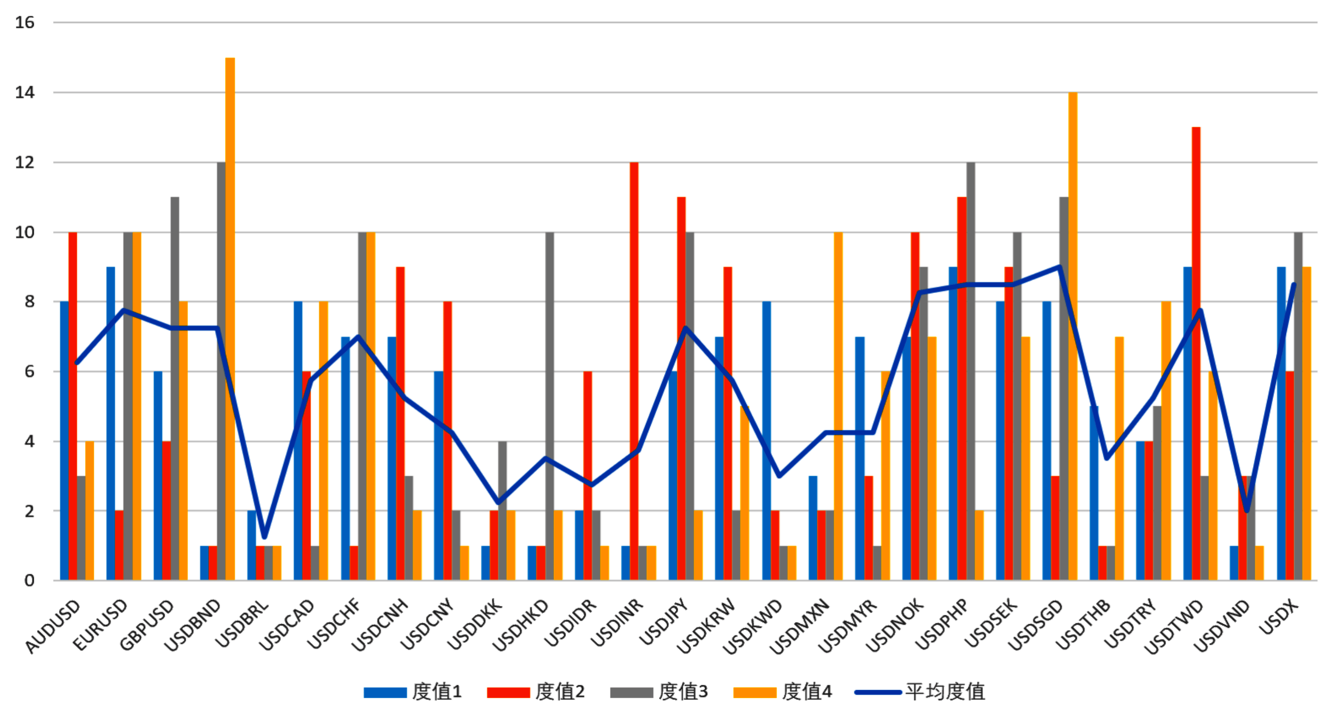 从图1可以看出,汇率的联动性呈现出明显的异质性,部分货币对的中心效应明显,比如USDNOK、USDJPY和美元指数等的度值均超过了10;而部分货币对的度值只有1,比如USDBND、USDBRL、USDDKK等,此类货币更容易受到其他货币的溢出效应影响。