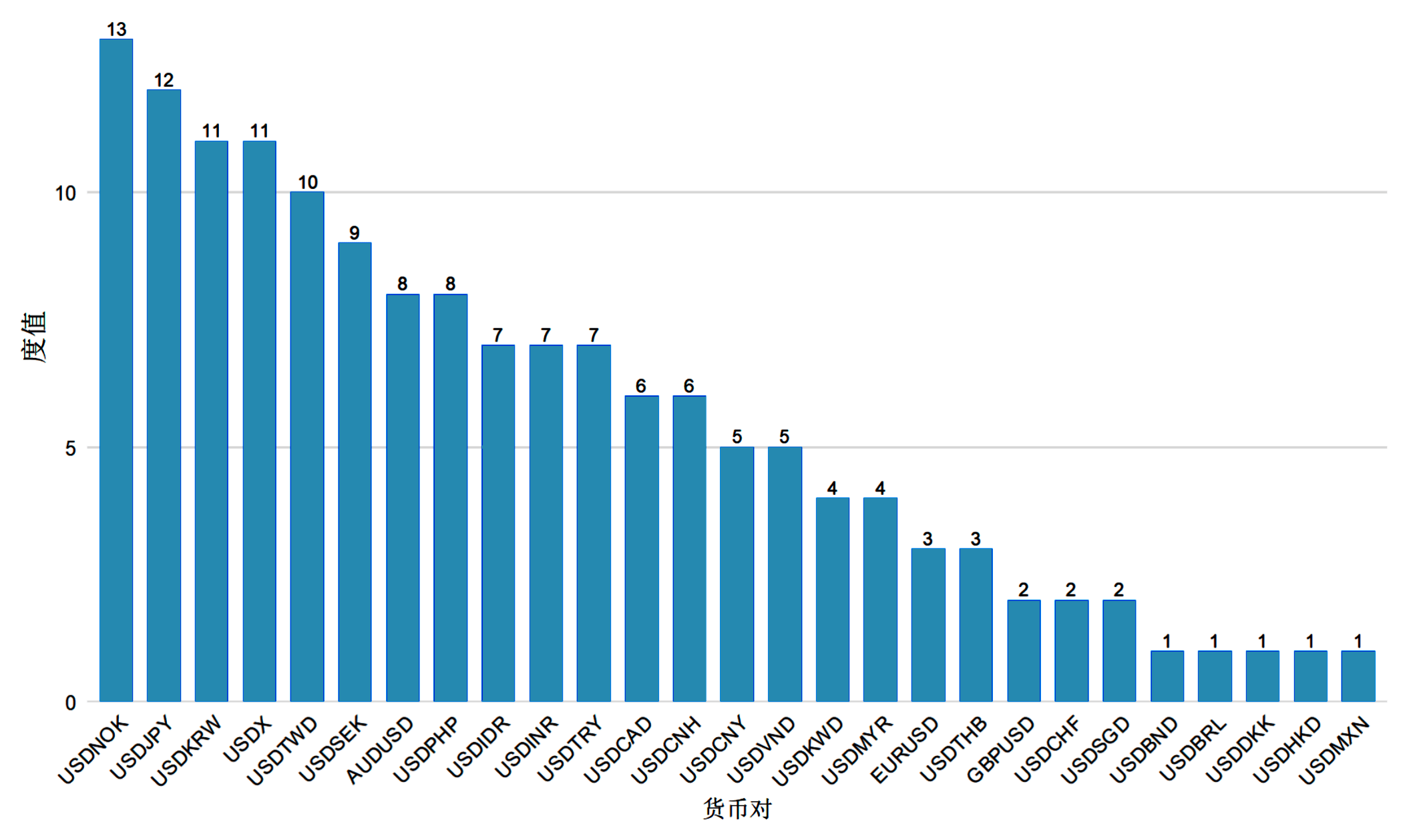 梳理现有文献后发现,近年来计量汇率联动性的方法主要有平面极大过滤图模型、GARCH模型族和VAR模型等。本文参考任鹏豪等(2023)的研究方法,分别从欧洲、美洲、亚洲和大洋洲中选择了26个主要货币对,通过平面极大过滤图法,构建上述26个货币对和美元指数在2018年1月1日至2025年8月12日间的汇率联动关系网络,并计算了每个货币对的连接数(称为度值)(图1)。