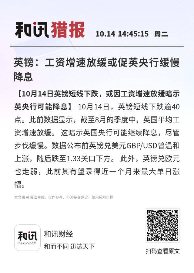【10月14日英镑短线下跌,或因工资增速放缓暗示英央行可能降息】10月14日,英镑短线下跌逾40点。此前数据显示,截至8月的季度中,英国平均工资增速放缓。这暗示英国央行可能继续降息,尽管步伐缓慢。数据公布前英镑兑美元GBP/USD曾温和上涨,随后跌至1.33关口下方。此外,英镑兑欧元也走弱,此前其有望录得近一个月来最大单日涨幅。