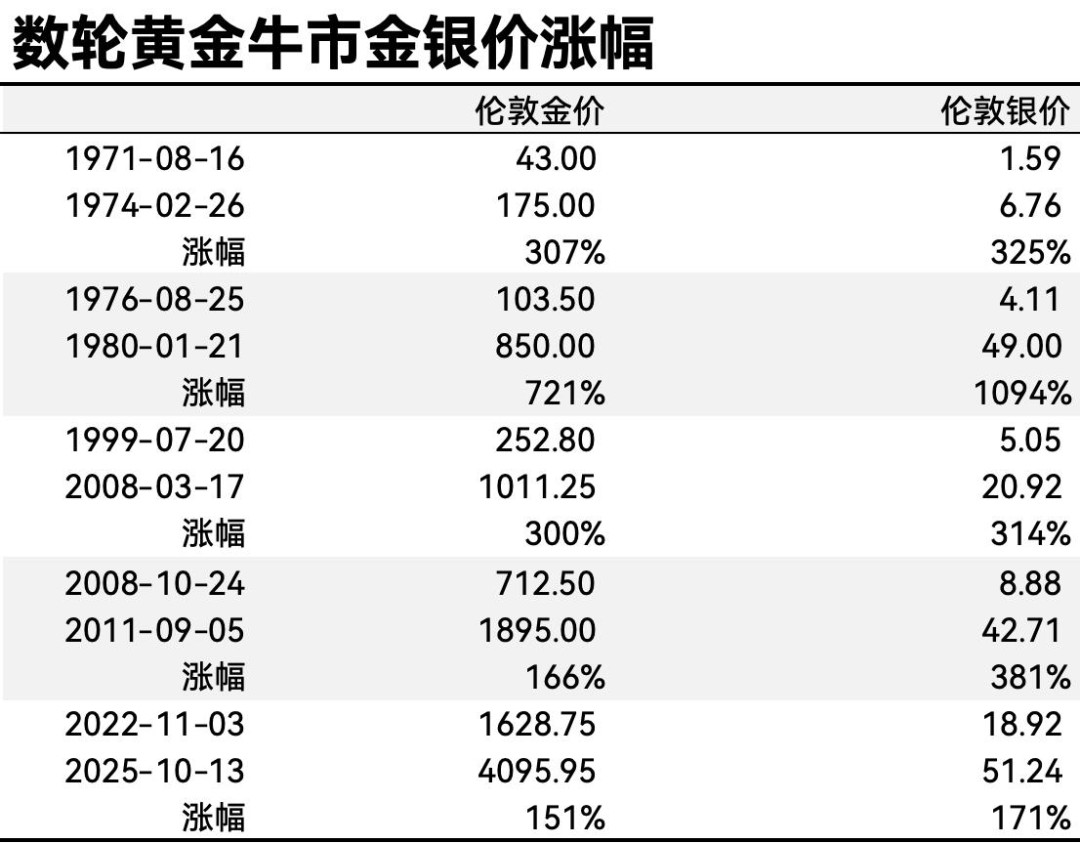 值得一提的是,记者统计历史上数轮黄金牛市的金银价涨幅,银价涨幅超过金价涨幅的规律同样得到了数次印证。例如,1976年至1980年这轮黄金牛市,伦敦黄金涨幅约720%,而伦敦白银涨1100%,明显超过黄金;尤其是2008年至2011年的一轮黄金牛市,黄金涨超160%,而白银则涨了380%,超过黄金涨幅的两倍。