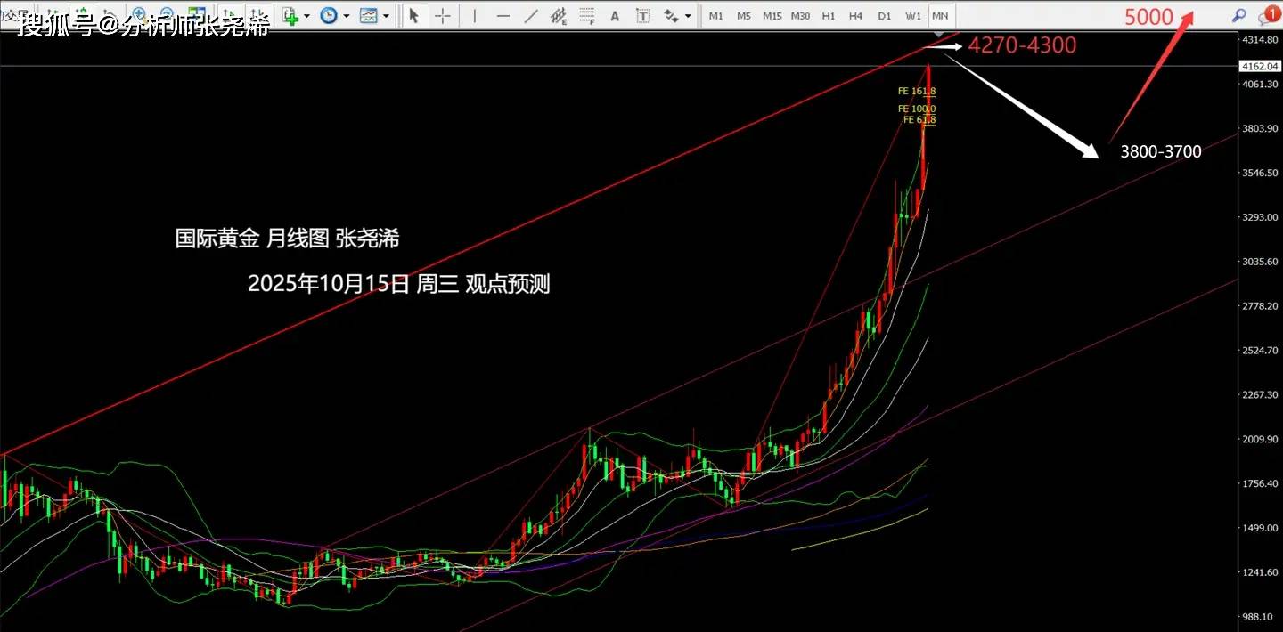 技术面是这样显示的,月图级别,根据上升趋势通道,预计在4280-4330区域,具体位置得看触及趋势压力时的实际价格是多少了。