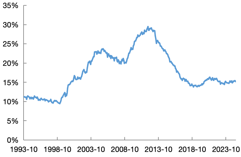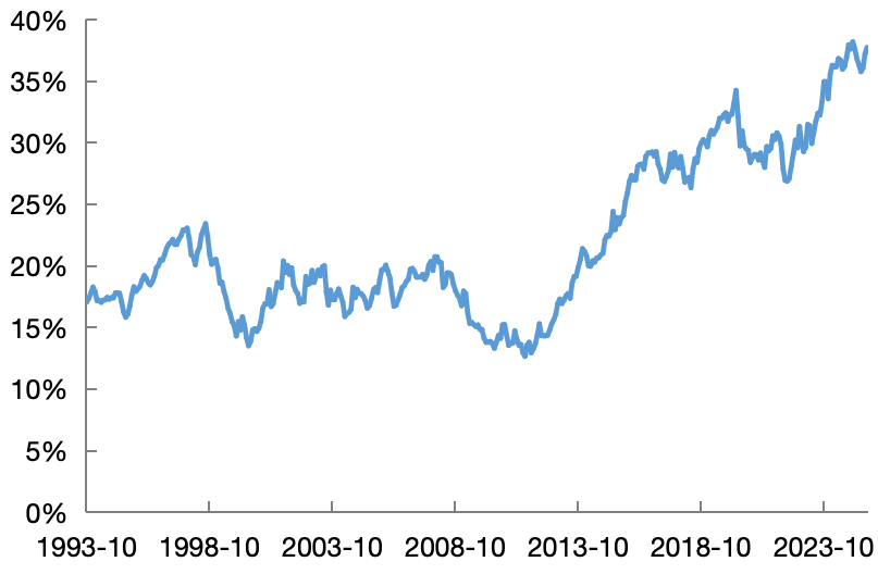 图3 1993年至今日本银行业海外证券占债券资产比重