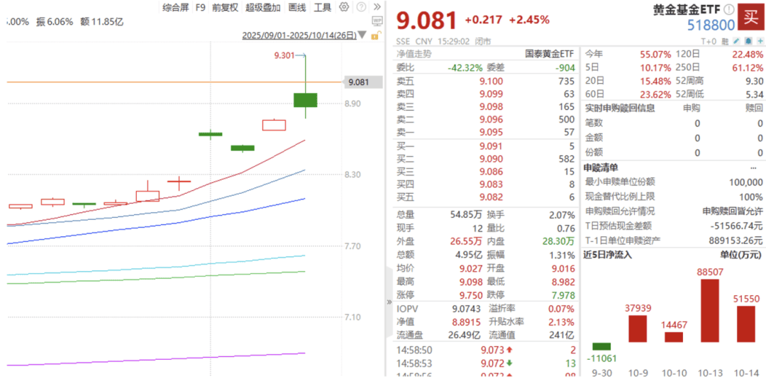 金价10月15日再创新高,COMEX黄金在10月9日小幅回调后,强势站上4200美元/盎司。黄金基金ETF(518800)上涨2.45%,位居市场前列。我们对黄金的中期逻辑仍然看好,建议关注黄金基金ETF(518800)。
