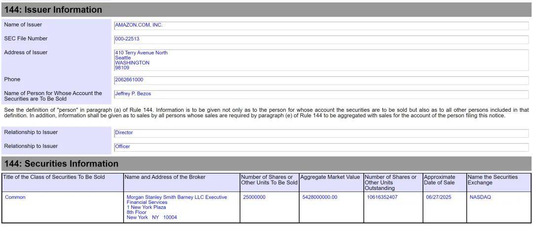 据亚马逊递交给美国SEC的文件显示,贝佐斯也在2025年6月27日减持2500万股,套现54.28亿美元。