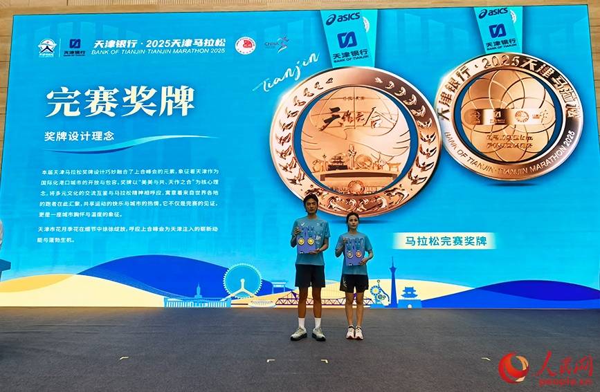 “天津银行·2025天津马拉松新闻发布会”发布完赛奖牌。人民网记者 陶建摄
