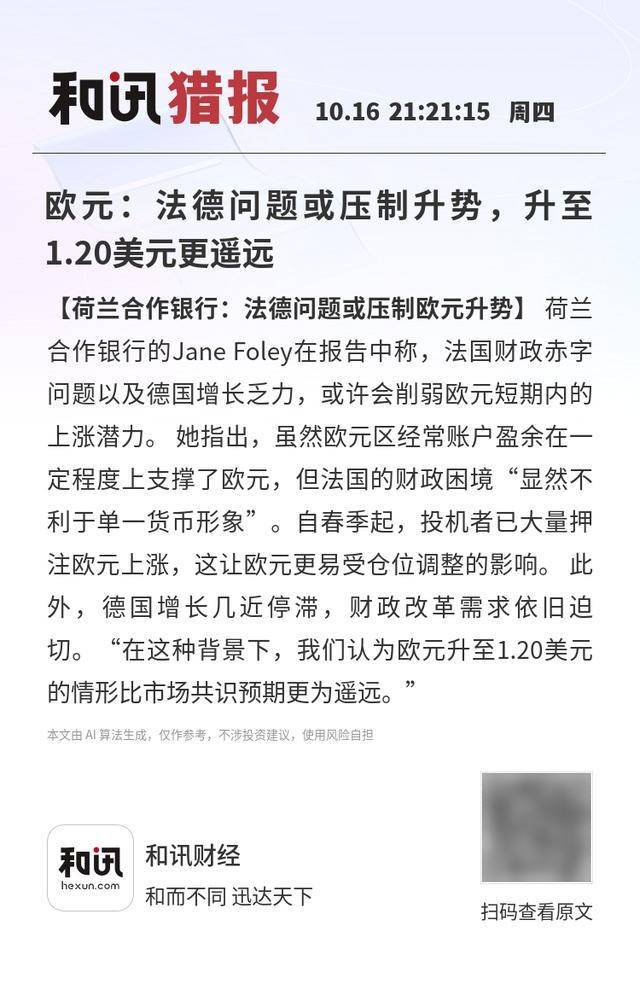 【荷兰合作银行:法德问题或压制欧元升势】荷兰合作银行的Jane Foley在报告中称,法国财政赤字问题以及德国增长乏力,或许会削弱欧元短期内的上涨潜力。 她指出,虽然欧元区经常账户盈余在一定程度上支撑了欧元,但法国的财政困境“显然不利于单一货币形象”。自春季起,投机者已大量押注欧元上涨,这让欧元更易受仓位调整的影响。 此外,德国增长几近停滞,财政改革需求依旧迫切。“在这种背景下,我们认为欧元升至1.20美元的情形比市场共识预期更为遥远。”