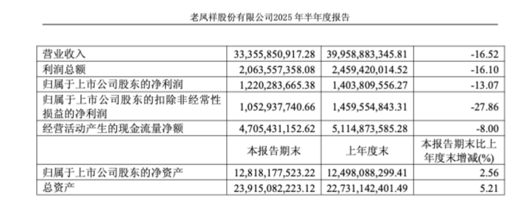 2024年,老凤祥营业收入同比下降20.5%,至567.93亿元;归母净利润下滑11.95%,为19.5亿元。这一颓势延续至2025年上半年,营收同比下降16.52%至334亿元,归母净利润同比减少13.07%至12.2亿元。