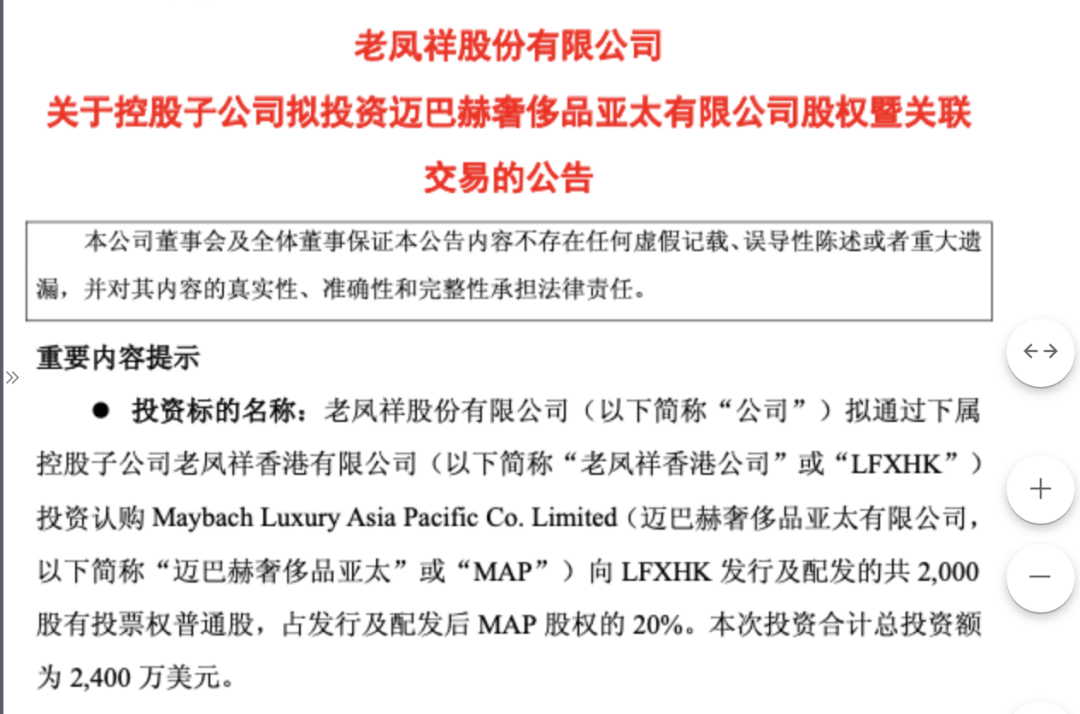 10月,老凤祥再进一步,通过旗下老凤祥香港有限公司以2400万美元认购迈巴赫奢侈品亚太公司(MAP)20%股权。MAP产品涵盖马具、服饰、运动用品、家居用品等奢侈生活方式领域,但不涉及迈巴赫汽车业务。