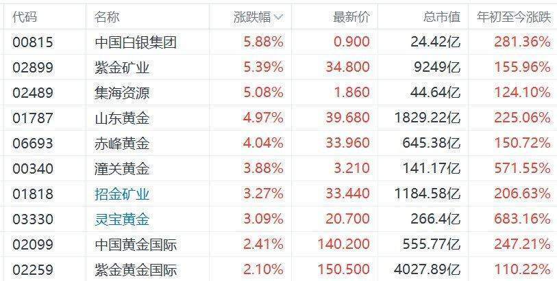 格隆汇10月17日|金价新高不断,市场股集体高开。其中,中国集团、、集海资源涨超5%,、涨超4%,潼关黄金、招金矿业、灵宝黄金涨超3%,中国黄金国际、紫金黄金国际涨超2%。消息面上,黄金盘中一度升破4380美元/盎司,再创历史新高。现货黄金年内累涨超65%。