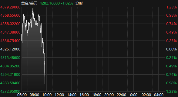 上证报中国证券网讯 据Choice数据,10月17日,国际现货黄金冲高至4379.29美元/盎司后短线下挫,截至9:45报4282.16美元/盎司,日内跌超1%。