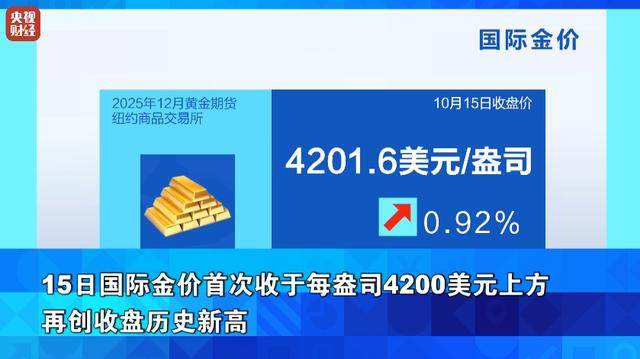 15日国际金价首次收于每盎司4200美元上方 再创收盘历史新高