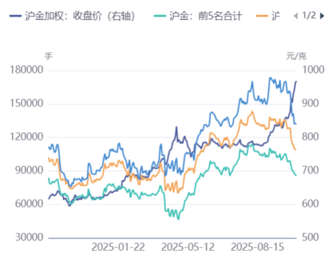 同时,黄金期货持仓量前10名、前20名席位的净多单持仓,也呈现下降态势。黄金期货持仓量前10名席位的净多单持仓量,从9月23日的13.61万手,下降至10月16日的10.92万手。黄金期货持仓量前20名席位的净多单持仓量,从9月23日的17.02万手,下降至10月16日的13.21万手。