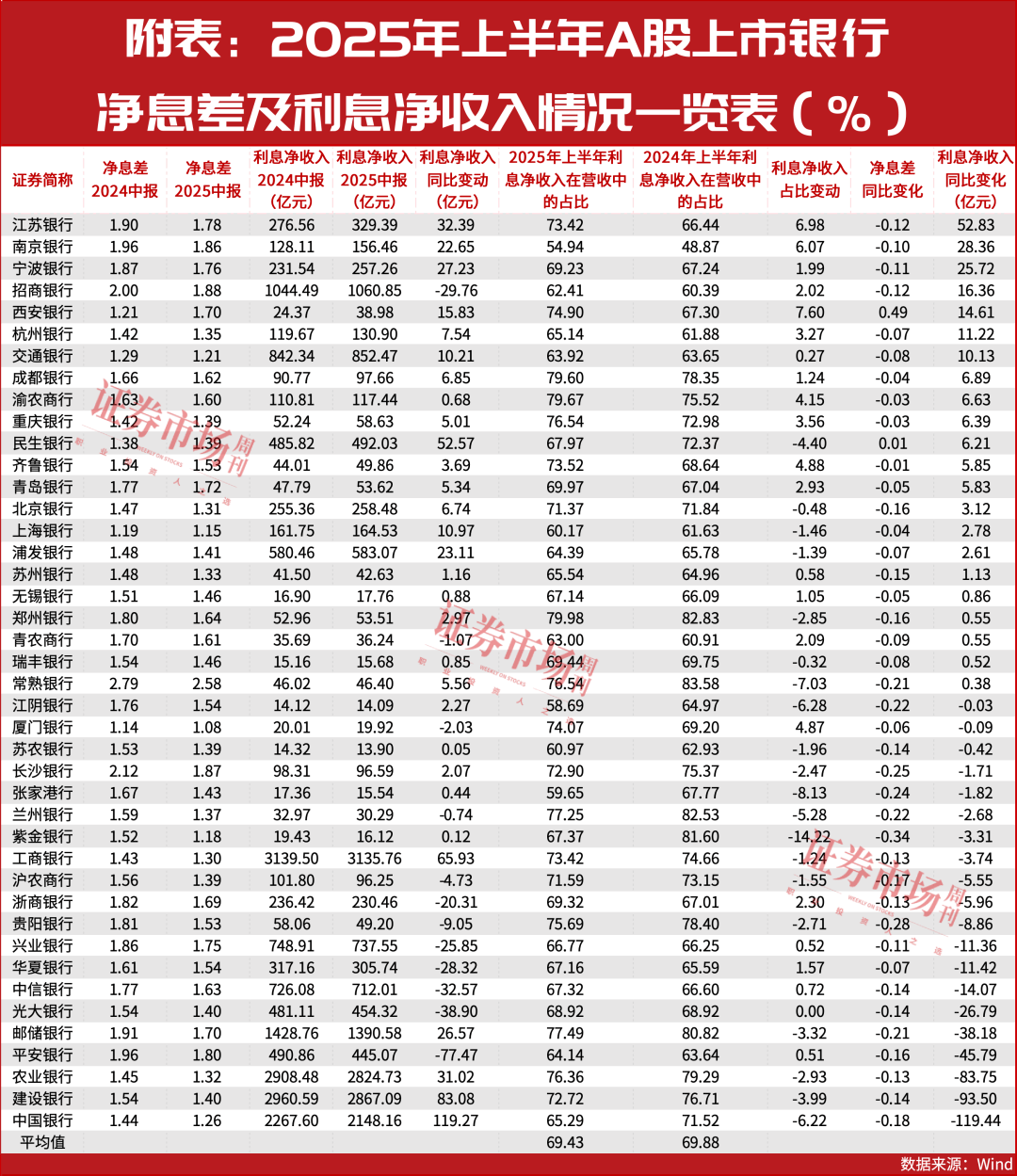 净息差持续走低已经持续近2年。2025年上市银行中报数据显示,净息差同比增长的只有2家,分别是民生银行和西安银行。Wind数据显示,西安银行的净息差从去年同期的1.21%提高至1.7%,民生银行的净息差则从去年同期的1.38%小幅提升至1.39%。
