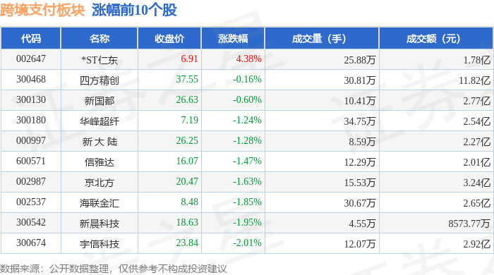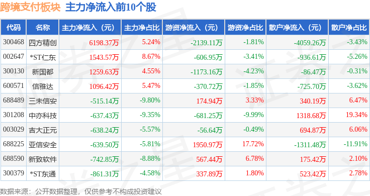 从资金流向上来看,当日跨境支付板块主力资金净流出19.07亿元,游资资金净流入5.15亿元,散户资金净流入13.92亿元。跨境支付板块个股资金流向见下表: