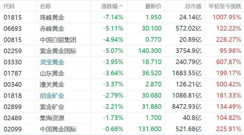 港股异动丨金价高位回调,黄金股集体下跌,赤峰黄金跌超5%