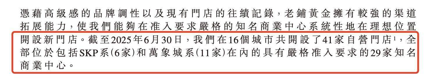 截至2025年6月30日,老铺黄金在16个城市共开设了41家自营门店,全部位于包括SKP系(6家)和万象城系(11家)在内的具有严格准入要求的29家知名商业中心。