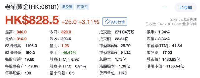 截至10月17日收盘时,老铺黄金报828.5港元,涨3.11%,总市值约1430.63亿港元。自年初至今,其股价累计上涨246.48%。