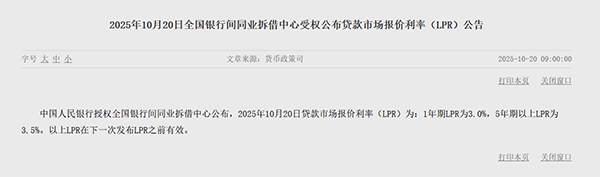 中国人民银行网站10月20日消息,中国人民银行授权全国银行间同业拆借中心公布,2025年10月20日贷款市场报价利率(LPR)为:1年期LPR为3.0%,5年期以上LPR为3.5%。以上LPR在下一次发布LPR之前有效。