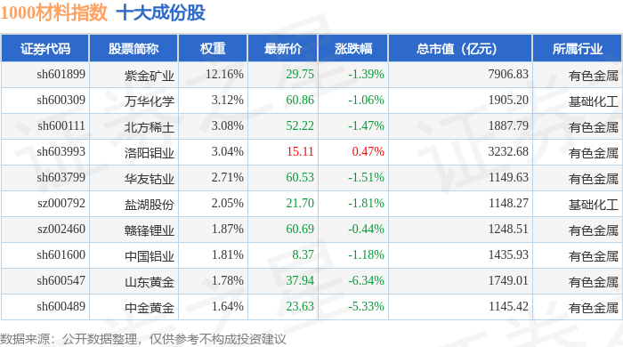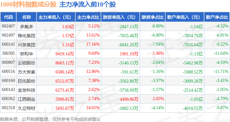 资金流向方面,1000材料(399382)指数成份股当日主力资金净流出合计43.73亿元,游资资金净流入合计4.22亿元,散户资金净流入合计39.51亿元。成份股资金流向详情见下表: