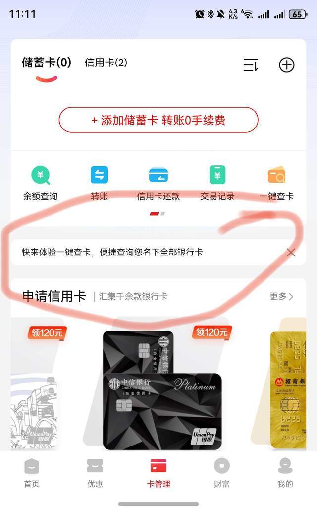 注册“云闪付”以后,点击“卡管理”,就会出现“一键查卡”的入口。
