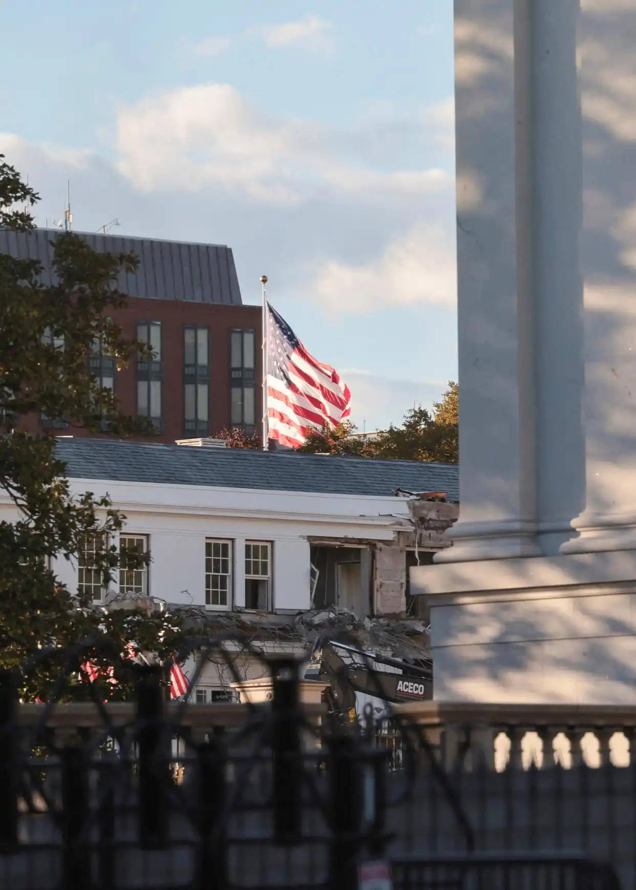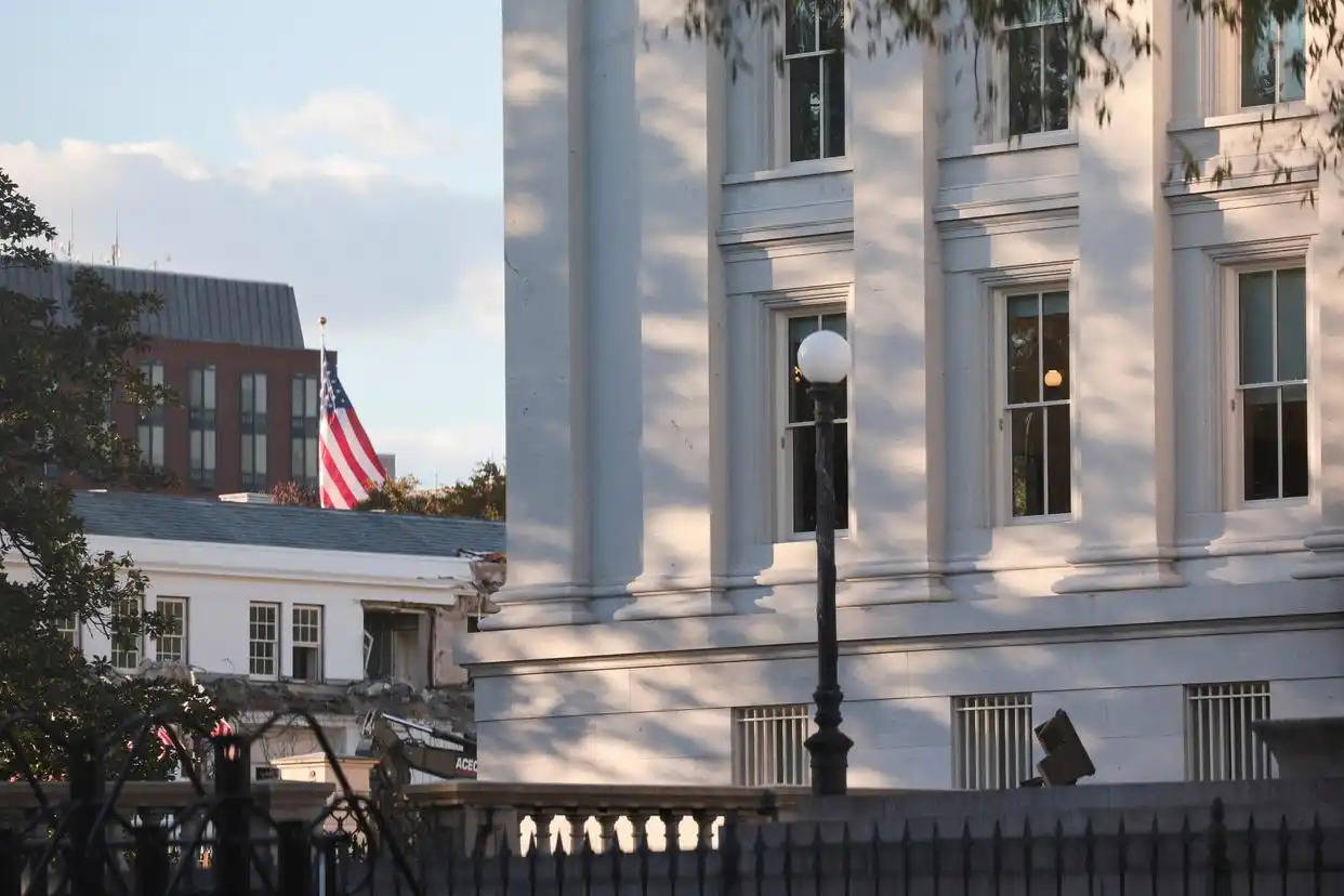 当地时间2025年10月20日,美国首都华盛顿,白宫东翼部分建筑的拆除工作现场。据美国媒体报道,美国总统特朗普20日宣布将耗费2.5亿美元的白宫豪华宴会厅已破土动工。新华社/美联