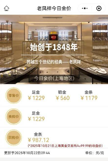 10月21日晚,黄金价格直线跳水,伦敦现货黄金大跌5.31%,COMEX黄金大跌5.07%,创2013年以来最大单日跌幅。受国际金价影响,国内金饰价格大幅回调。10月22日,周生生足金首饰价格由前一日的1289元/克下调至1250元/克,每克大跌39元;老凤祥足金首饰价格由前一日的1290元/克下调至1229元/克,每克大跌61元;老庙黄金足金首饰价格由前一日的1294元/克下调至1211元/克,每克大跌83元。