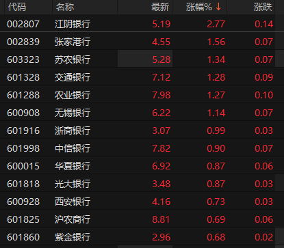 10月22日早盘,银行板块震荡拉升,农业银行涨逾1%,继续刷新历史高点,总市值近2.8万亿元,江阴银行涨近3%,张家港行、苏农银行、浙商银行、交通银行等涨幅靠前。