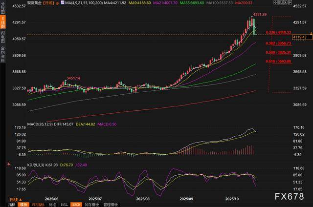 美国国内政治动态也扮演了重要角色。联邦政府停摆已持续三周,导致关键经济数据如9月份消费者物价指数(CPI)报告延迟发布,这增加了市场不确定性。但民主党领袖查克·舒默和Hakeem Jeffries提出在特朗普亚洲行前与其会晤,就医疗补贴谈判以结束停摆的消息,给市场注入了一丝乐观情绪。国家经济委员会主任Kevin Hassett也表示,停摆有可能在本周结束。这些发展进一步降低了避险需求,推动金价下行。