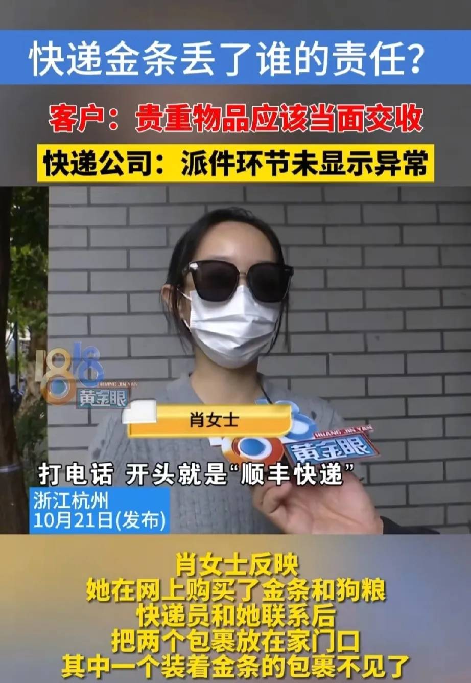 可丢了的5克金条怎么办?肖女士越想越气:“贵重物品就该当面交,哪怕我说放门口,小哥也该提醒我里面是金条啊!附近有快递柜,他也不建议我放那儿,现在丢了就得赔!”