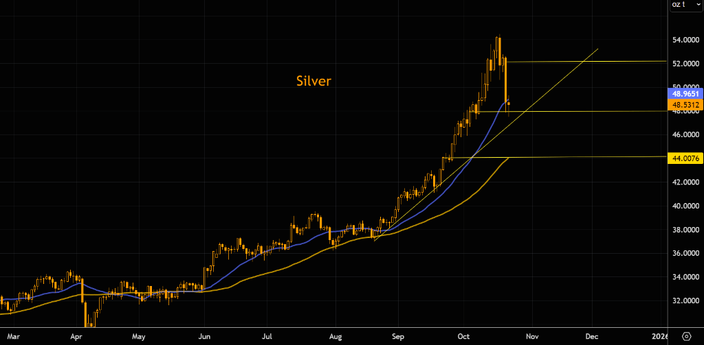 与此同时,白银市场也同步承压。银价正围绕其21日移动平均线波动,并徘徊在48美元这一关键水平附近。分析指出,该点位是白银短期的“成败线”,其有效性将直接影响投资者情绪。若失守48美元,或将下探44美元。