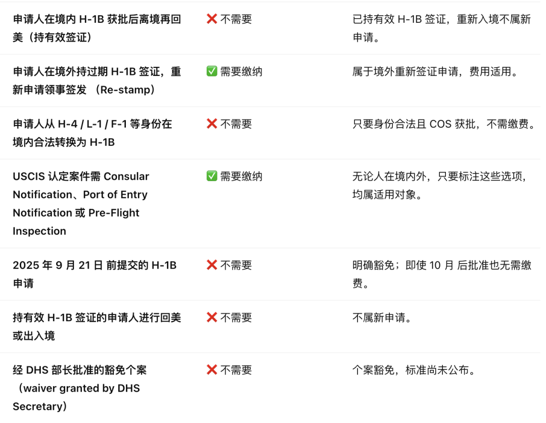 ❌ 以下类型的申请则无需缴纳10万美元费用: