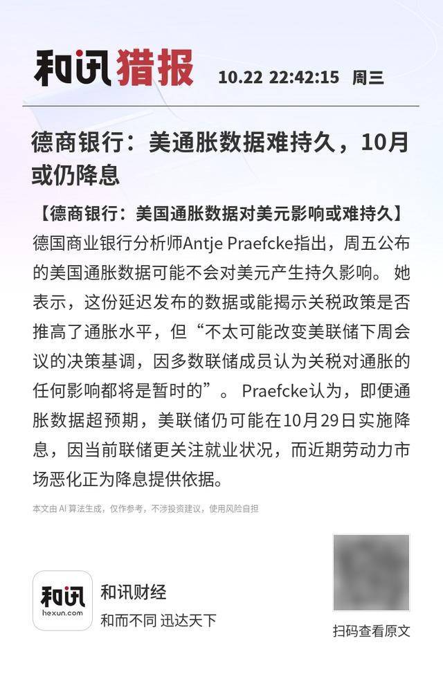 【德商银行:美国通胀数据对美元影响或难持久】德国商业银行分析师Antje Praefcke指出,周五公布的美国通胀数据可能不会对美元产生持久影响。 她表示,这份延迟发布的数据或能揭示关税政策是否推高了通胀水平,但“不太可能改变美联储下周会议的决策基调,因多数联储成员认为关税对通胀的任何影响都将是暂时的”。 Praefcke认为,即便通胀数据超预期,美联储仍可能在10月29日实施降息,因当前联储更关注就业状况,而近期劳动力市场恶化正为降息提供依据。