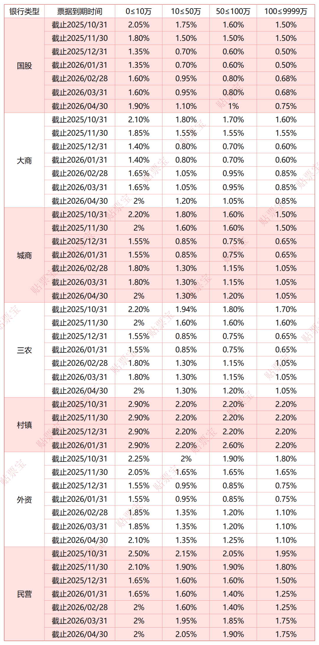 2025年10月23日中国央行开展2125亿元7天逆回购操作,投标量2125亿元,中标量2125亿元,操作利率为1.40%,与此前持平。今日有2360亿元逆回购到期。贴票宝整理了多家银行的贴现报价,以下为2025年10月23日承兑汇票贴现利率报价表: